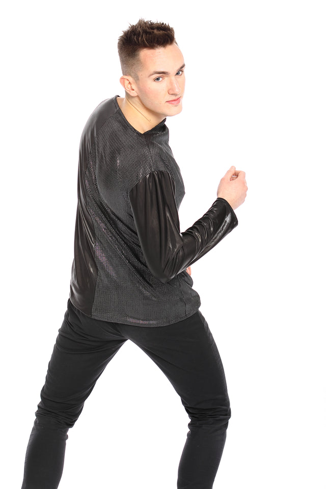 Soft long sweater with long sleeves with black and black fabrics with silver stripes from the genderless collection. Unique piece.