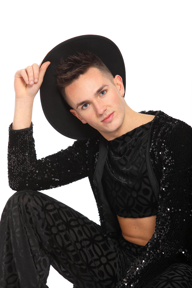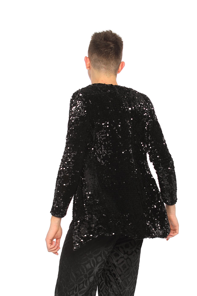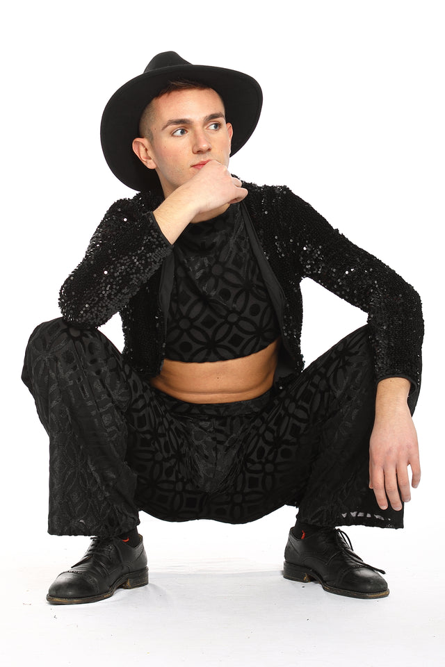 Top and palazzo pants set in chenille worked with patterns that create transparency. Black. One-of-a-kind, suitable for a glamorous sporty outfit. Combined with a black straw jacket with a minimal line.